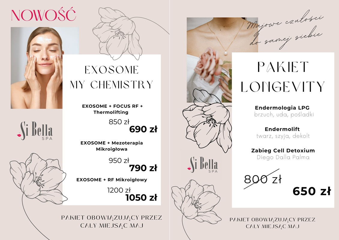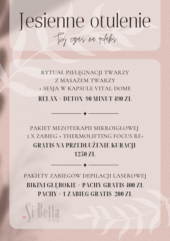 W naszym gabinecie kosmetycznym czeka na Ciebie mnóstwo zabiegów upiększających i pielęgnacyjnych. Kosmetyczki pracujące w salonie urody Si Bella Spa odpowiedzą na wszystkie pytania i doradzą w wyborze zabiegu. Nasz gabinet oferuje zabiegi anti-aging (odmładzające) oraz odchudzające. Dzięki nim osiągniesz swoją wymarzoną sylwetkę i poczujesz się dobrze w swoim ciele. Wśród naszych propozycji znajdują się również liczne masaże i wspaniałe rytuały pielęgnacyjne.